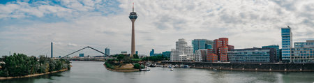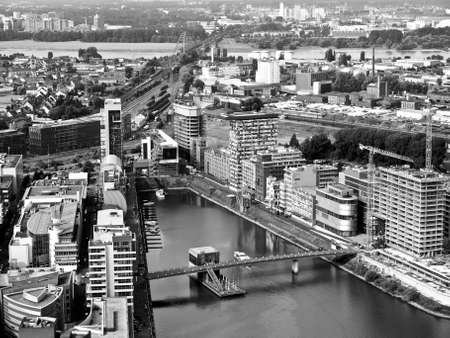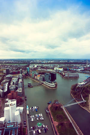 Wide angle picture of river Rhine, Duesseldorf. Seen from the television tower Rheinturm, Germany . Duesseldorf mediahafen (harbour) in Rheinland-Westphalia