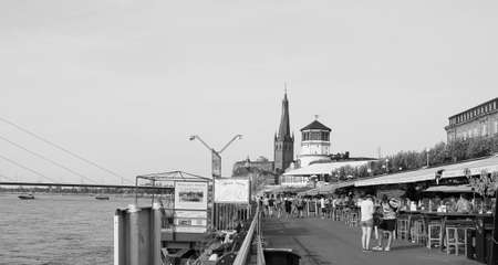 DUESSELDORF, GERMANY - CIRCA AUGUST 2019: People on Rheinuferpromenade on the bank of river Rhein in the Altstadt (old town) in black and white