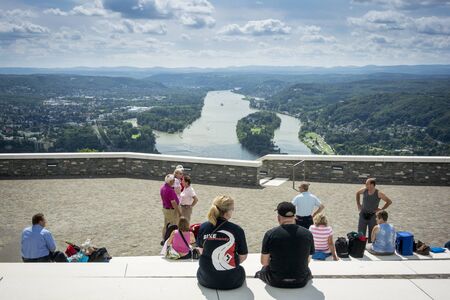 Tourists enjoying the view of the River Rhine and countryside, Castle Drachenburg, Germany