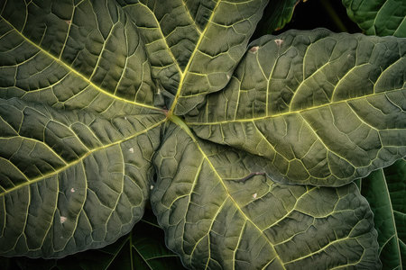 An overhead close-up presents a green leaf with intricate textures and visible veins. The image displays shades of green with varying tonal depths. The detailed composition suggests outdoor origins, potentially in a natural setting. Suitable for projects related to nature and botanical studies; potentially useful in design and illustrative contexts.
