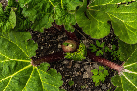 Bud of young rhubarb and large green leaves. Spring seasonal of growing plants. Gardening concept background, selective focus