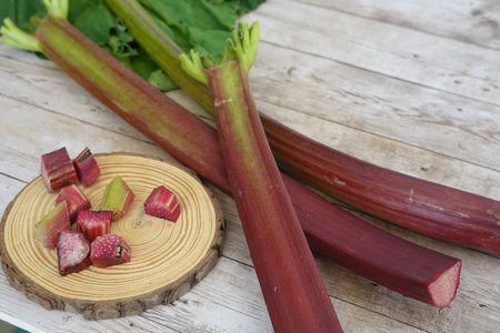 Vibrant red rhubarb stalks lie on a wooden table alongside a wooden disc displaying freshly chopped pieces, ready for culinary use