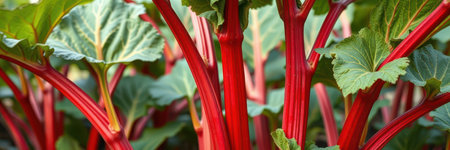 A field of rhubarb under the bright sun, highlighting the freshness and abundance of nature on a summer day. Ideal for a rural scene.
