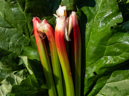 Bundle of big, fresh, ripe fleshy, edible stalks of rhubarb harvested from garden placed on green leaves. Seasonal vegetable
