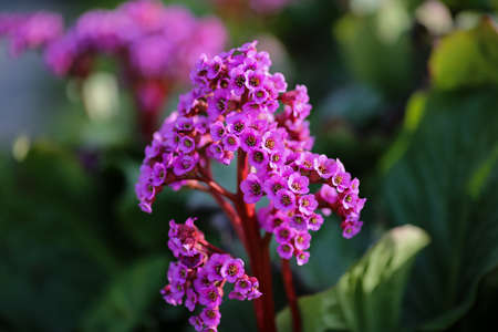 Medical plant Bergenia Cordifolia blooming in the garden