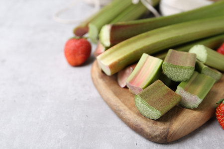 Cut fresh rhubarb and strawberries on light table, closeup. Space for text