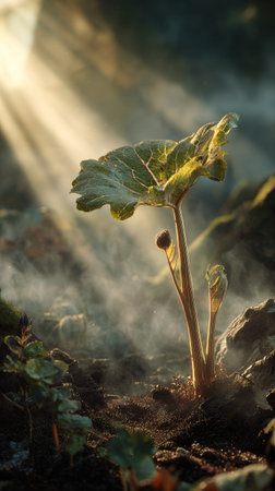 A cinematic wide shot of a young Coltsfoot growing, slightly larger than before, its trunk and branches beginning to take shape, surrounded by rich, dark soil and faint morning mist, golden sunlight breaking through the clouds, soft beams illuminating the growing tree, ultra-realistic photography with true Earth like realism natural hues, no artificial colors, deep 3D parallax depth creating an immersive, awe-inspiring atmosphere, subtle natural lens flares, minimal 35mm film grain, tranquil and hopeful tone, 8K, highly detailed