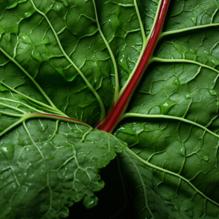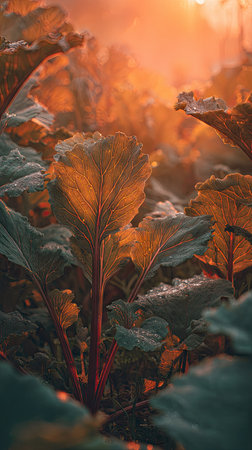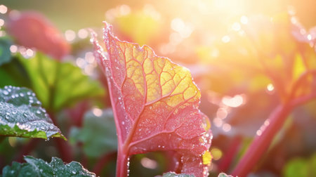 Close-up of dewy rhubarb leaves glistening in the warm morning light. The vibrant colors and textures create a serene and refreshing scene in nature.