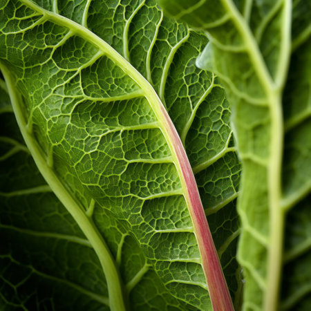 a close-up photo of a broccoli leaf captured with the samyang 14mm f2.8 if ed umc aspherical lens. the image showcases the intricate organic shapes and lines of the leaf, with photorealistic detail in dark green and pink hues. the leaf's textural details highlight the beauty of organic architecture found in norwegian nature. ai generated