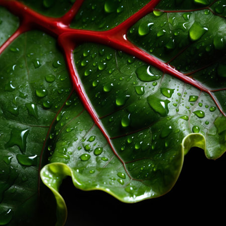 leaf lettuce close up with water droplets, resembling the artistic style of caras ionut. the vibrant colors of dark green and crimson create a visually striking image. captured in stunning 8k resolution, the photo showcases the intricate organic contours of the lettuce. softbox lighting enhances the details, reminiscent of the works of santiago calatrava and giorgione. ai generated