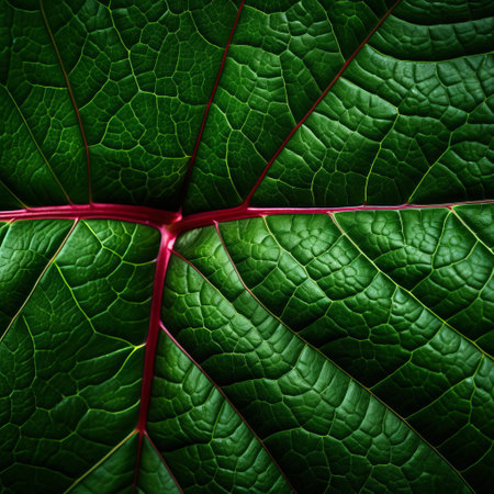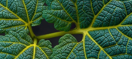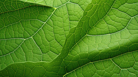 A detailed macro shot of a vibrant green leaf, showing the intricate network of its veins. The image captures the beauty of nature's details.