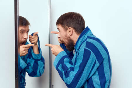 a man in a blue robe examines himself in a mirror in a bright room cropped view
