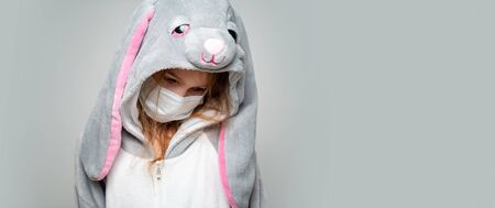 teen girl in kigurumi rabbit in a medical mask at home in quarantine. close up. copy space. lower head