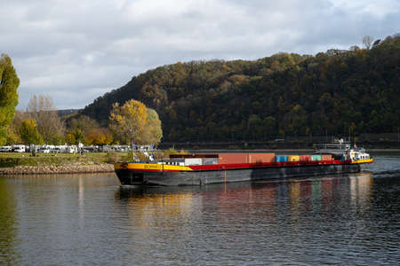 November 1, 2021 - Koblenz, Germany: A river barge at the German Corner were rivers Rhein and Mosel meet