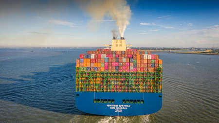 Hoek van Holland, the Netherlands - January 20 2019: cargo shipping container vessel mirror sailing out of port Rotterdam past Hoek van Holland and Maasvlakte harbour