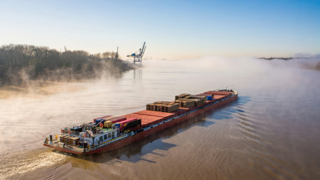 Long cargo barge navigating misty river near port infrastructure. Generative AI.