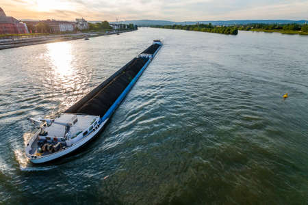 Cargo ship with coal bulk load on the river Rhine in Mainz, Germany