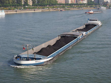 KOELN, GERMANY - CIRCA AUGUST 2019: barge transporting earth on river Rhein