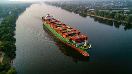 A large cargo vessel navigates a calm river, loaded with colorful shipping containers. The morning light reflects on the water, surrounded by lush greenery and distant cityscape