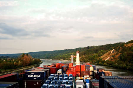 Mainz, Germany - September 23, 2013 A container ship sails along the Rhine and passes the city of Mainz on September 23, 2013 in Mainz
