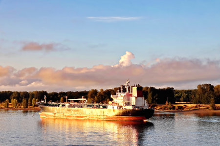 Koblenz, Germany - May 23, 2019. A large tanker ship sailing in Germany on the Rhine River. Transportation of oil, gas and gasoline.
