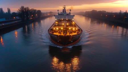 Cargo Ship Navigating a River During Sunset With Illuminated Deck and Calm Water Reflecting the Warm Colors of the Sky. Generative AI