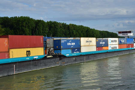 Inland shipping transport on rhine river near germersheim
