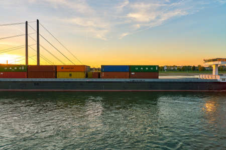 Container ship on river Rhine (Rhein) in Bonn, Germany