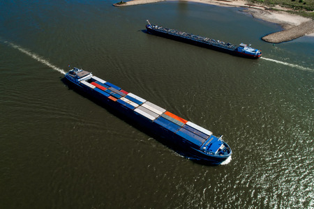 Rhine - Netherlands, July 14, 2018: aerial view of a merchant ship with a container crossing the river Rhine in a region of the Netherlands