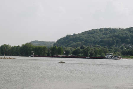Königswinter, Germany - May 7, 2022: Shipping. Cargo barge. Magnificent panoramic view of the Rhine valley. A beautiful landscape on a navigable river in Germany