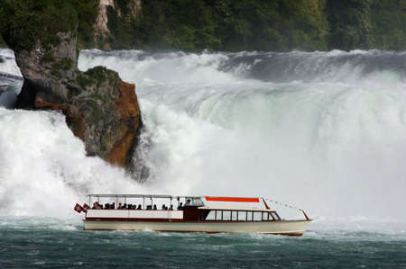 Schaffhausen, Switzerland - October 2019: Sightseeing boat taking tourists to the Rhine Falls, famous and biggest waterfall in Europe on the Rhine River in Switzerland
