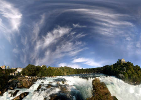 Rhine falls near Schaffhausen. 200° panoramic picture of the biggest European waterfall in Switzerland. On the right side Castle Lauffen.