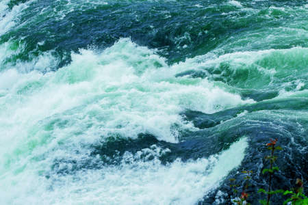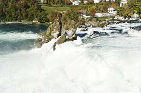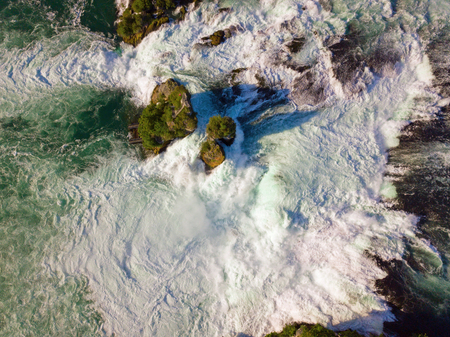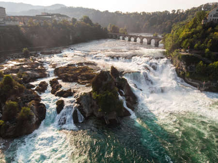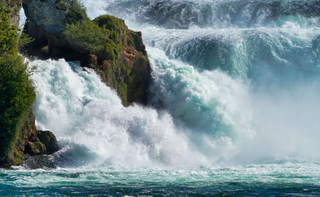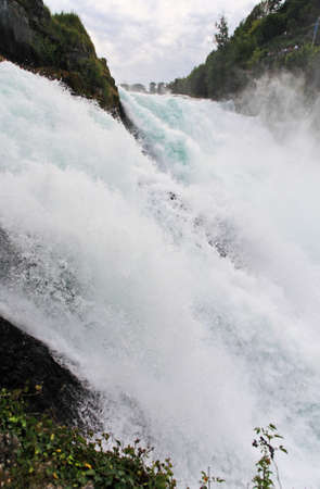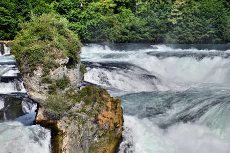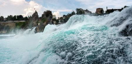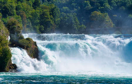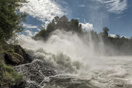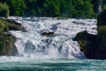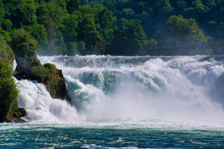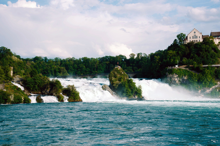 Mighty white rapids of the Rhine River at the Rhine Falls, the famous and biggest waterfall in Europe located in Schaffhausen, Switzerland
