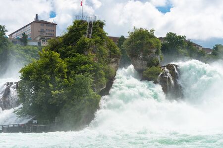 Neuhausen am Rheinfall, Switzerland - 23 July 2019. Waterfall on the river Rhine in the city of Neuhausen am Rheinfall, Schaffhausen in northern Switzerland. The Rhine Falls is the largest waterfall in Europe.