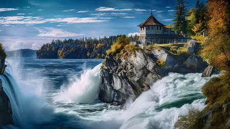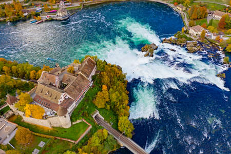 Stunning Rhine Falls in autumn. Majestic waterfall, scenic landscape.
