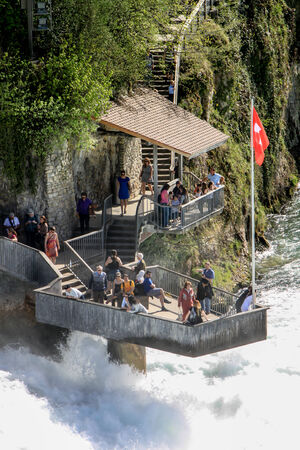Rhine, Switzerland - September 19, 2018: Observation deck for tourists near the Rhine falls in Switzerland. The largest waterfall in Europe