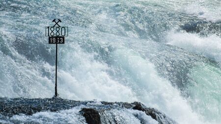 Sign 1880 in the middle of the roaring waters of the Rhine Falls near Schaffhausen.