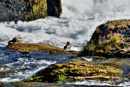 Lovely duck is having a beautiful day at the rhine falls in Switzerland 20.5.2020