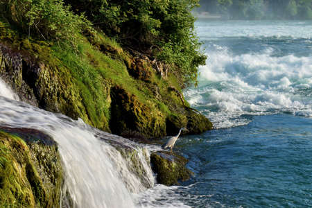 Heron is waiting to catch some fish at the rhine falls in Switzerland 20.5.2020