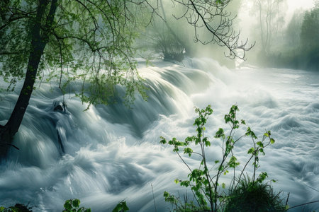 Experience the captivating beauty of a waterfall shrouded in mist, with a bridge creating a seamless connection to nature's serene and tranquil atmosphere.