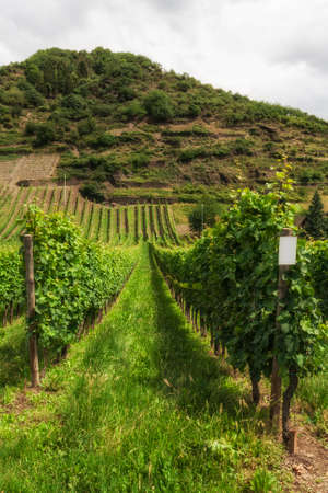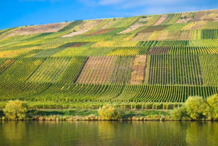 Terraced hilly vineyards in Luxembourg. Traditional method of production of white wine and cremant sparkling wine in Luxembourg country on Mosel, Mosel, Moselle or Musel river.
