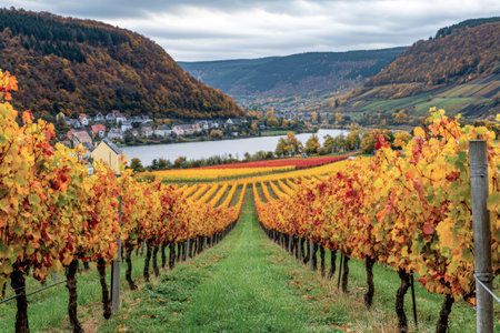 Picturesque autumn vineyard with golden and red grapevines in scenic hillside landscape