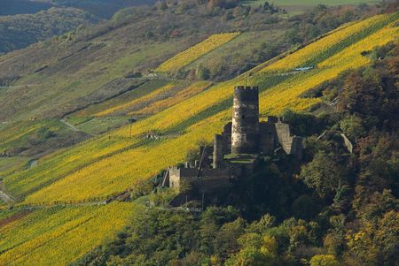Medieval knight's castles and ruins. Castle Stahleck stands on a ledge of a mountain slope. Warm autumn in Germany. Beautiful wooded slopes of the coastal hills of the river Rhine.