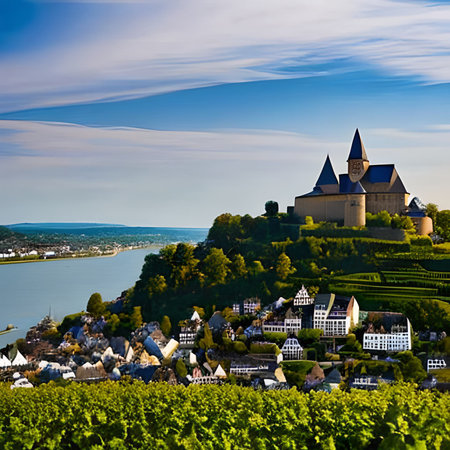 Lose yourself in a Rheinland reverie, where the serene Rhine River reflects the majestic silhouettes of castles against the backdrop of vineyards, offering a mesmerizing glimpse into Germany's scenic allure. AI-generated