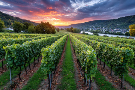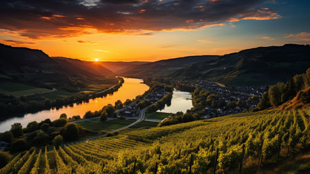 Serene vineyard stretching down a hill with a picturesque view of a winding river and a historic castle at sunset. the scene warm hues of early autumn with lush green vines and tranquil natural beauty. Generative AI