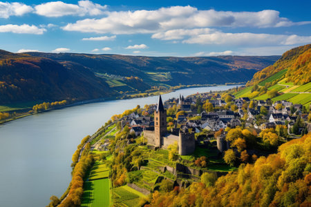Beautiful German landscape with tiered vineyard and village seen from the middle Rhine River.