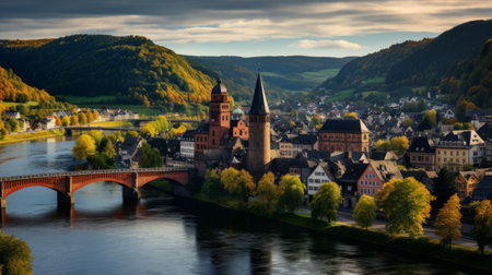 a town with old buildings, a hill, and a river is captured in this stunning photograph. the image, taken in the style of schlieren photography, showcases the intricate foliage and grandeur of the architecture. with a resolution of 8k, the colors of light crimson and dark amber add a sleek and captivating touch to the scene. ai generated