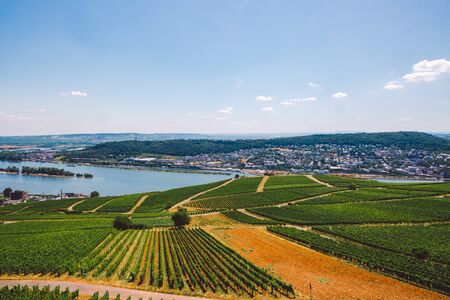 Panorama of the middle Rhine River valley with beautiful vineyards sloping down to a distant medieval village of Rudesheim, Germany.