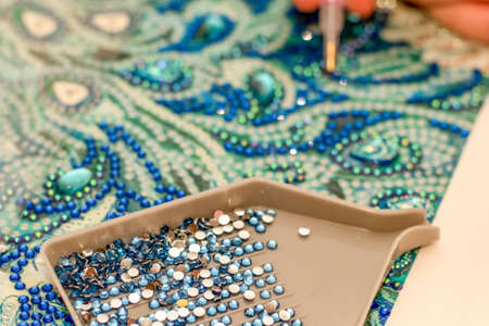 Diamond painting embroidery craft. Acrylic rhinestones and hand holding a pen. Closeup, selective focus.
