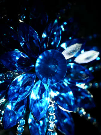 Brilliant crystal rhinestones on the sparkling blue holiday background. Flat lay, hard shade from the sun
